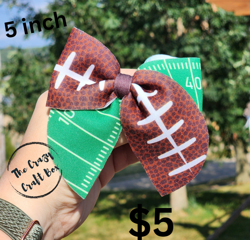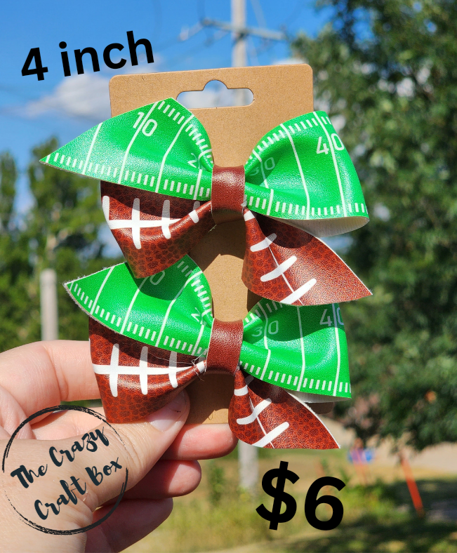 3 options to choose from, regular neoprene bow with ball and field, a football shape Hair bow, or a field and ball set of piggies