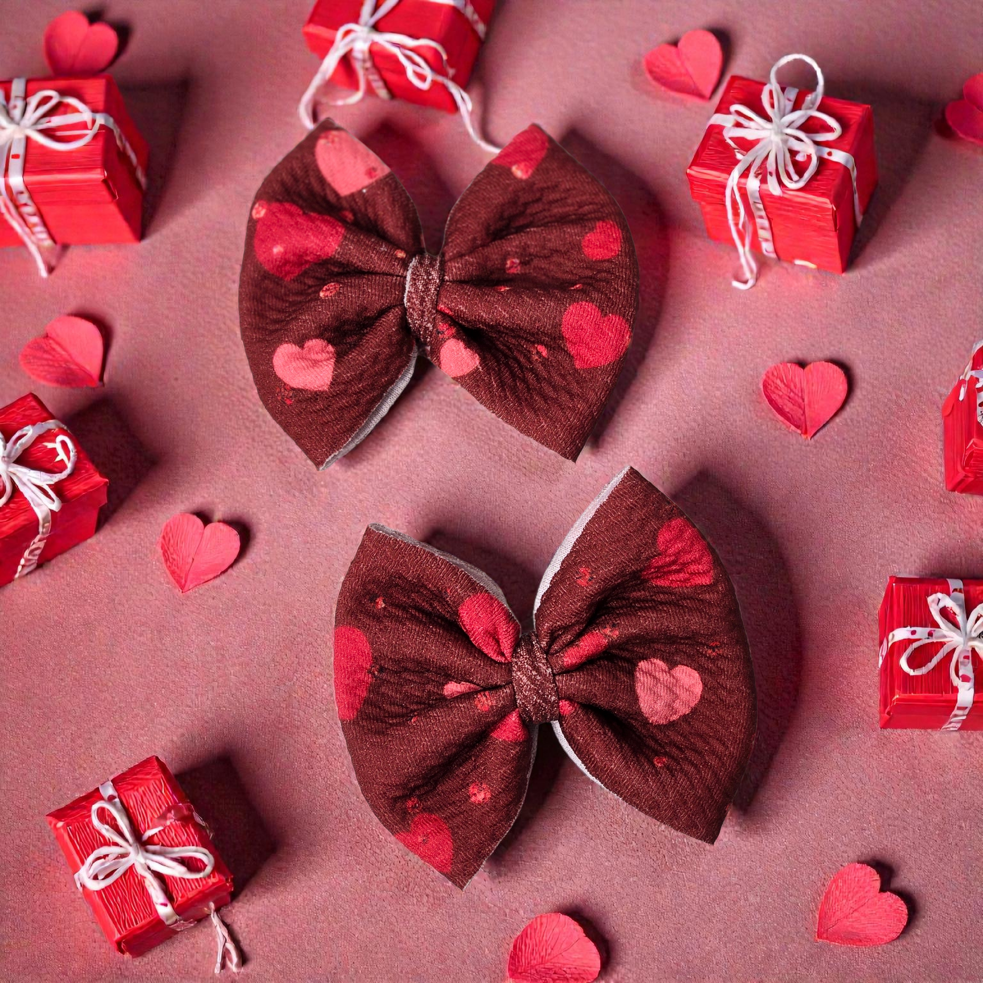 Our Valentine Heart Scrunchie & Bows feature a rich chocolate-brown fabric accented with playful pink and red hearts—sweet, stylish, and perfect for Valentine’s Day.