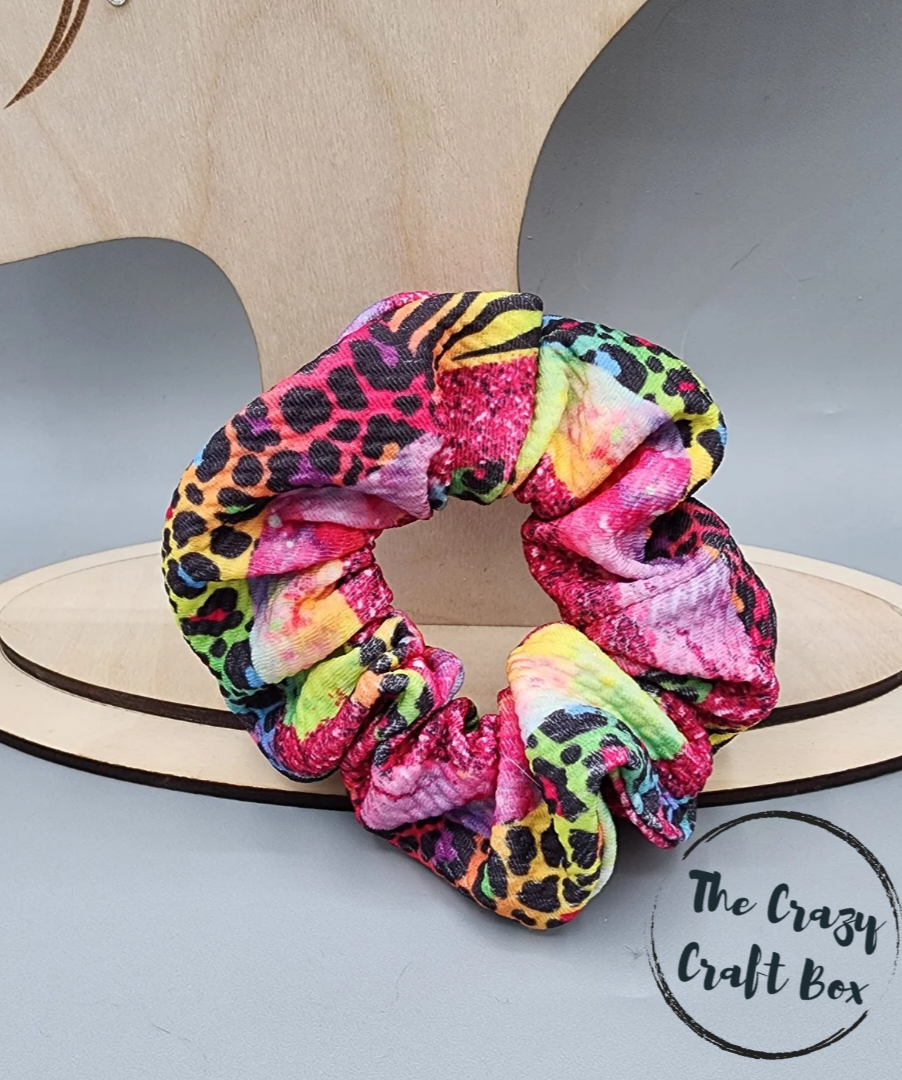 A zebra print paint stripe scrunchie combines the wild and stylish elements of zebra print with a bold paint stripe design. The scrunchie features the classic zebra stripes in black, interspersed with a vibrant paint stripe, in pink, yellow, green, and purple.
